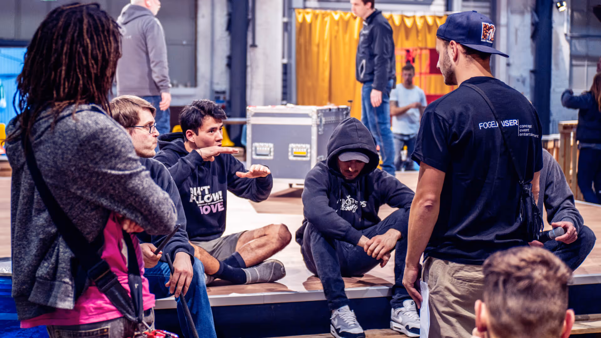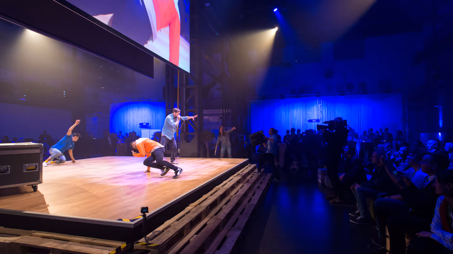 Für die Sage Awardverleihung entwickelte FOGELKAISER eine dynamische Urban-Inszenierung, die die charakteristische Architektur des Areal Böhler – industriell, roh, authentisch – als kreativen Ausgangspunkt nutzte. Die Show verband Streetkultur, akrobatische Höchstleistungen und musikalische Energie zu einem performativen Spannungsbogen, der das Publikum von Beginn an fesselte und den Weg zum Höhepunkt des Abends bereitete: der Enthüllung des Award-Pokals. Die dramaturgische Leitidee: Energie im gesamten Raum zu verteilen, sie durch die Artists sichtbar zu machen und schließlich auf der Mittelbühne zu bündeln – als Symbol für Fokus, Leistung und Auszeichnung.