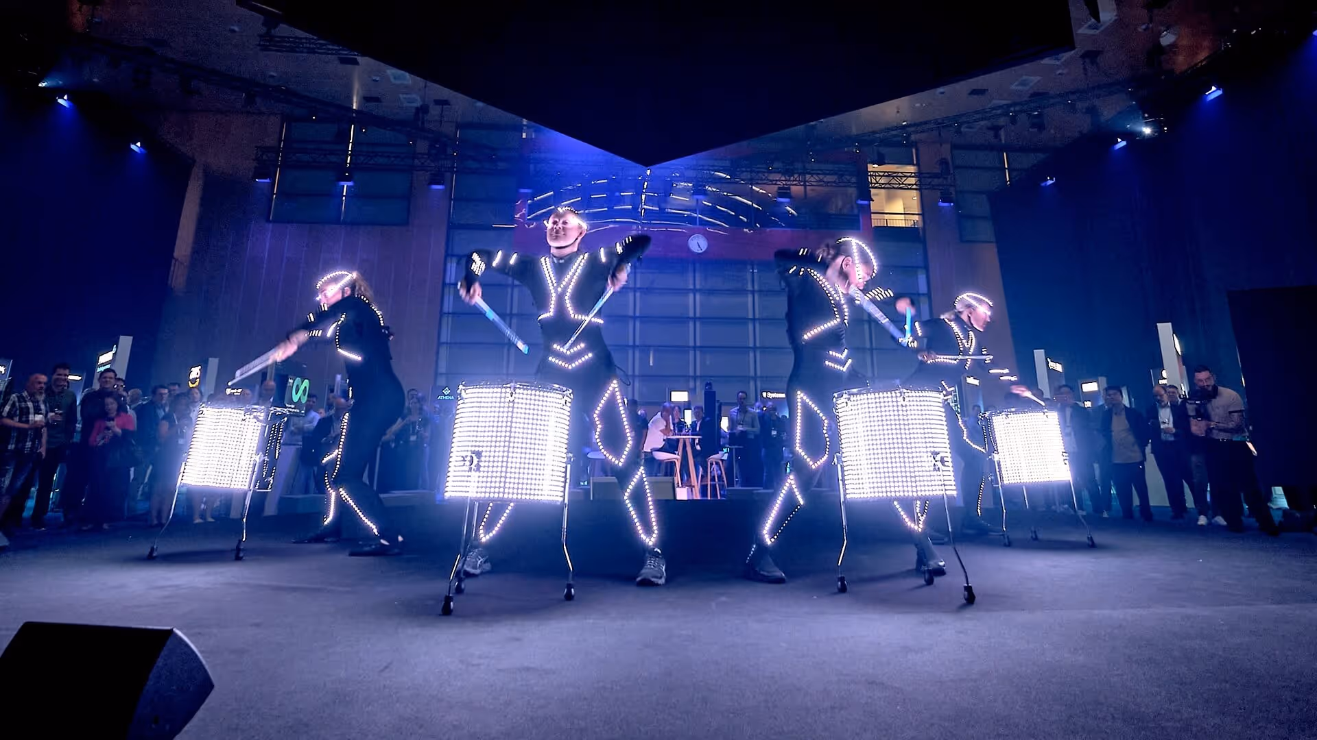 Die Performance verband futurale Bildsprache, klare Linien des Corporate Designs und präzise Choreografien, um den technologischen Charakter des Events live zu transportieren.