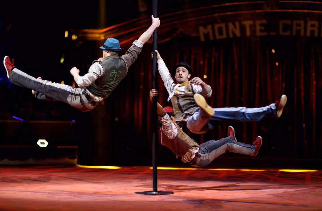 Chinese Pole Shows sind moderne Akrobatik Shows, die Parkour-Sprünge mit vertikaler Artistik am Chinese Pole kombinieren.