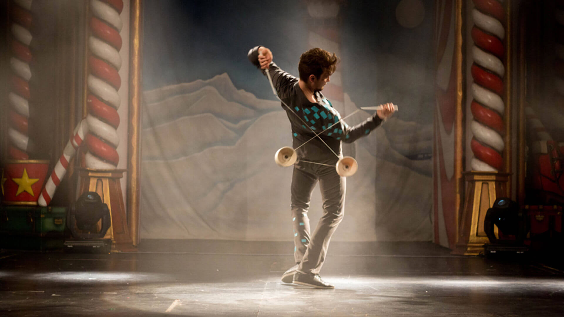 Ein artistischer Live-Act, bei dem Diabolos rhythmisch und choreografiert in Bewegung gesetzt werden – oft begleitet von Musik, Licht und visuellen Effekten.