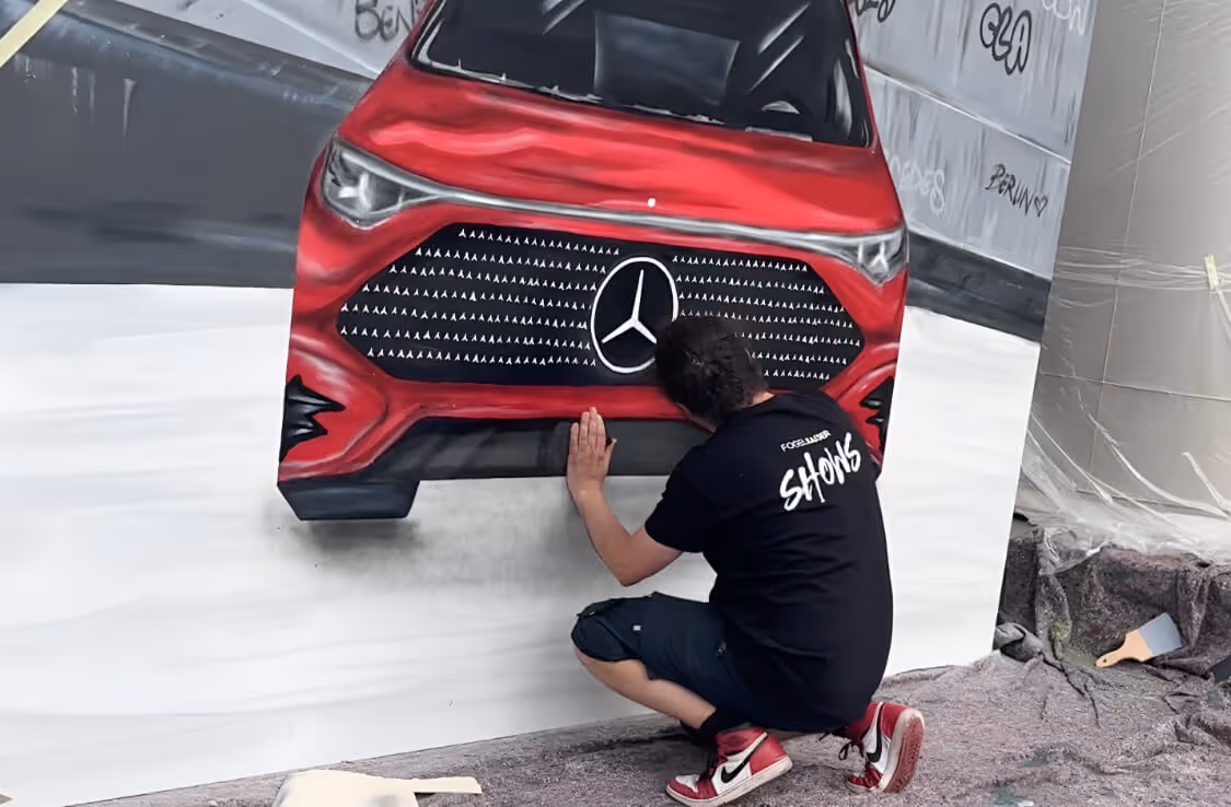 Eine Live-Street-Art Performance, bei der ein Künstler vor Publikum ein Motiv sprayt – oft als Markenmoment, Highlight oder Messe-Eyecatcher.