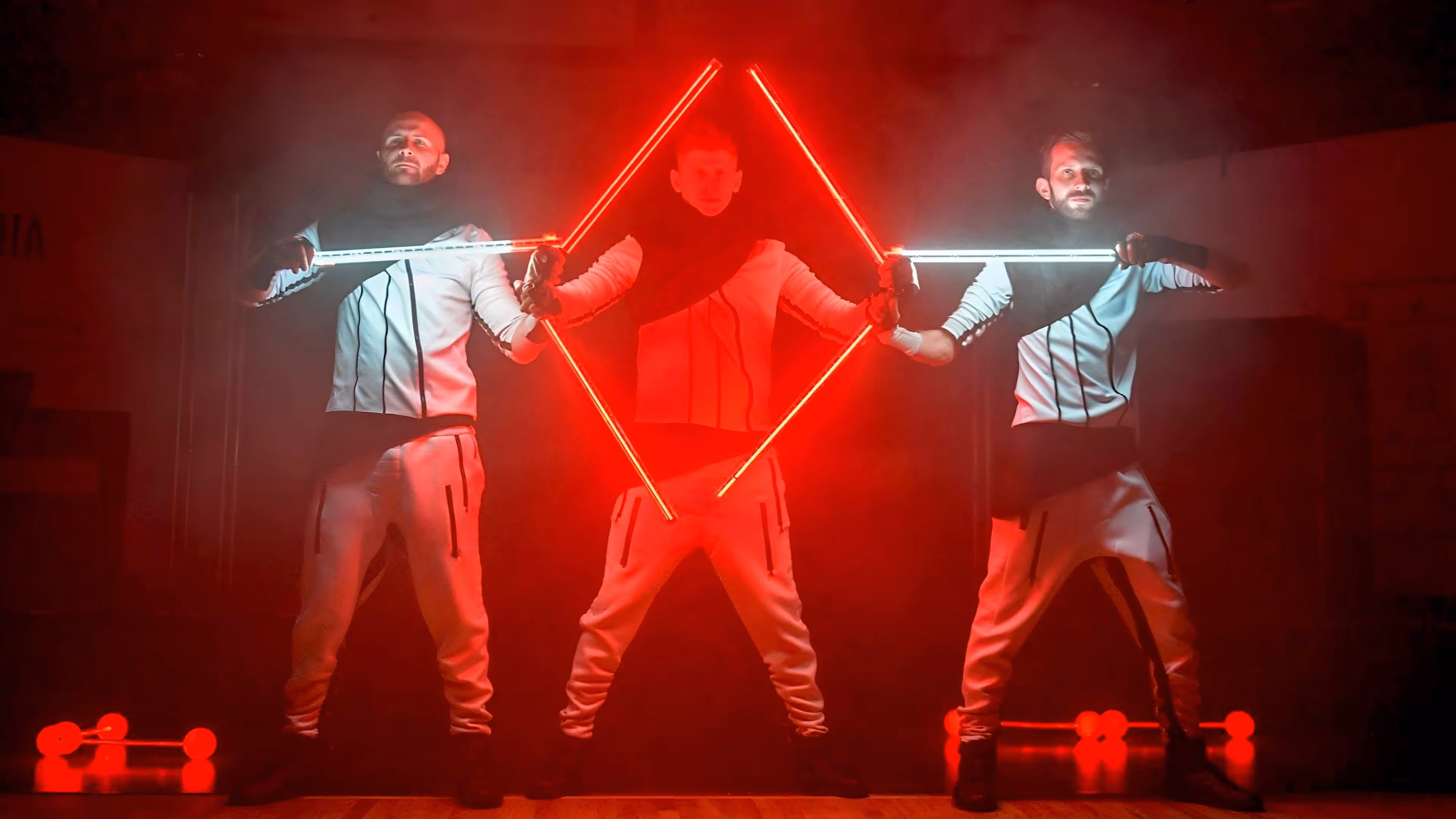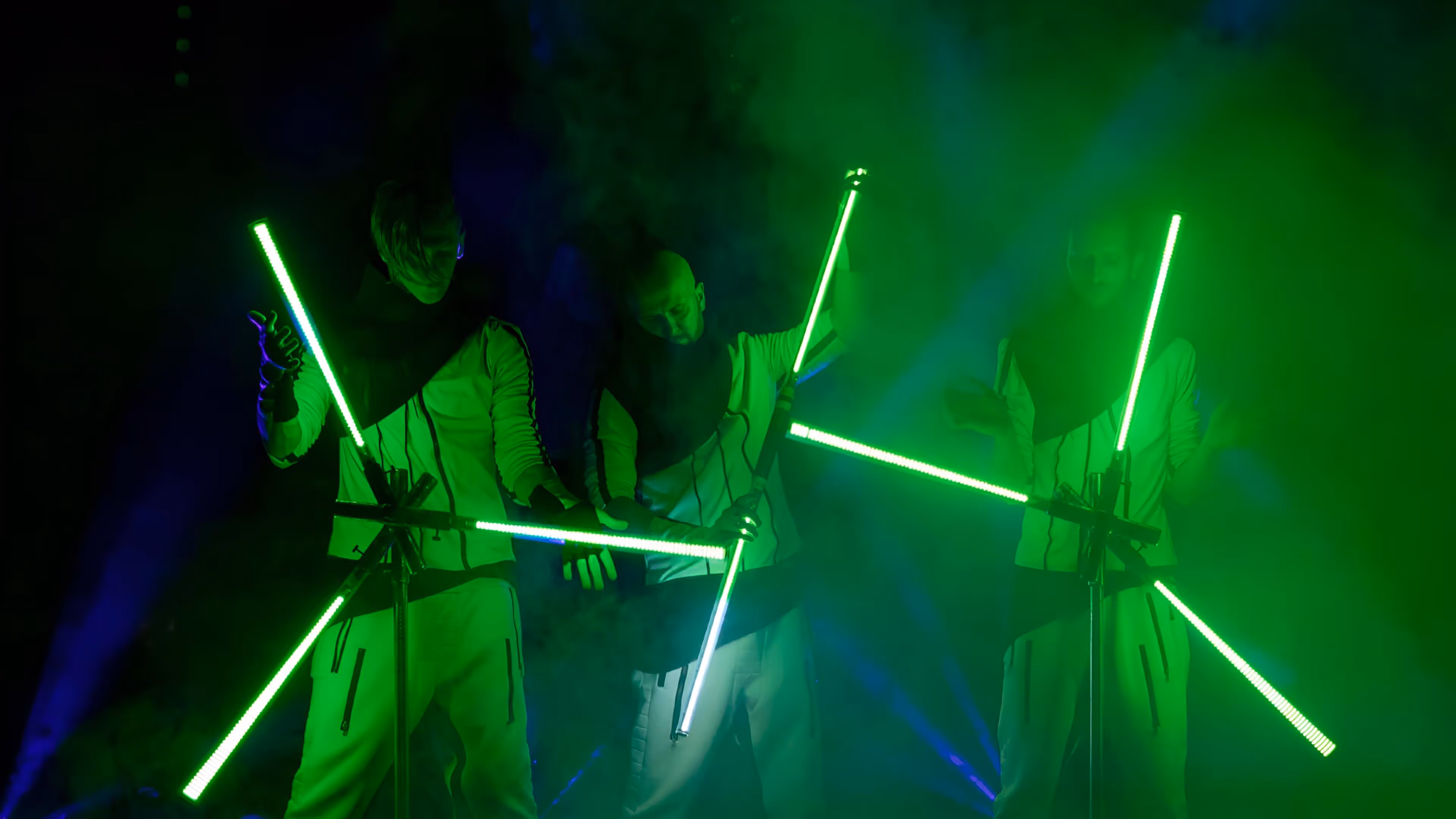 Eine choreografierte Performance, bei der Laser, LED-Requisiten und Bewegung synchron zur Musik inszeniert werden – visuell präzise und emotional wirkungsvoll.