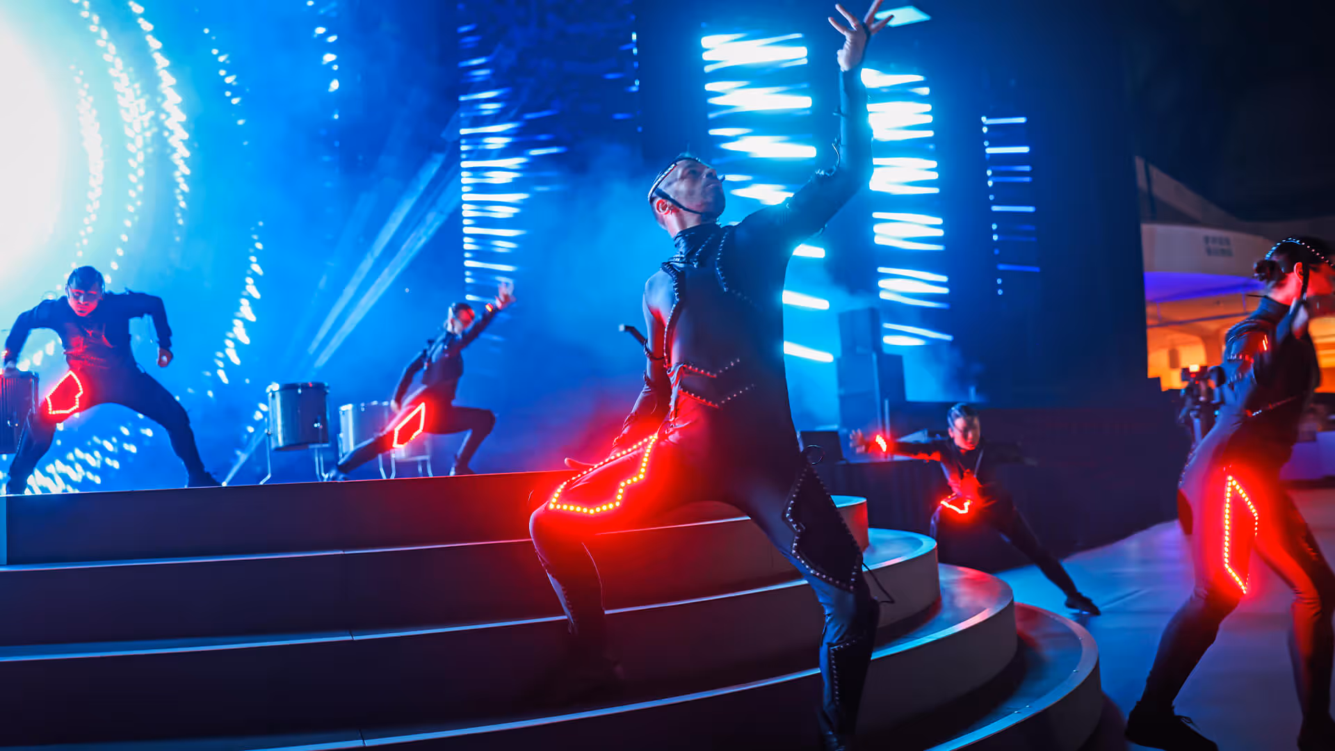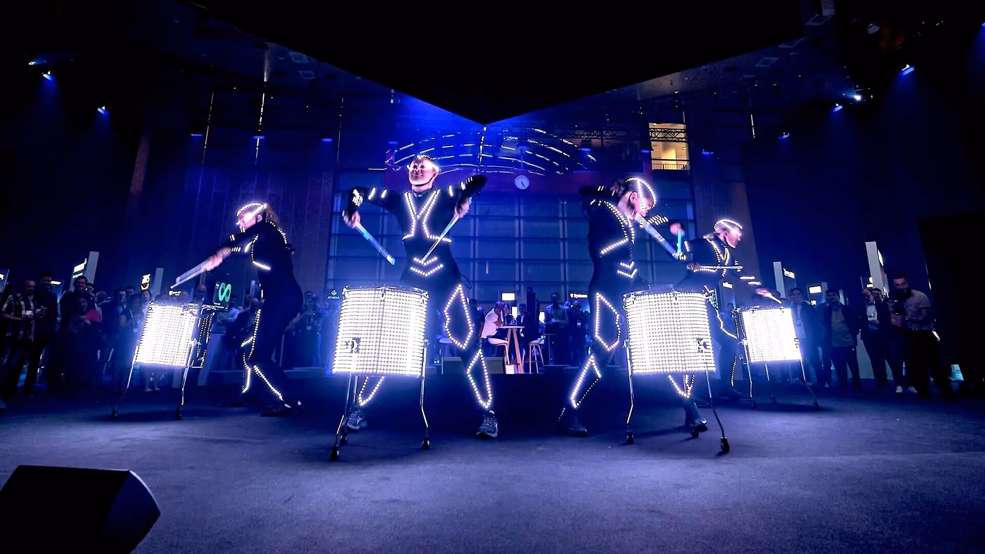 Eine LED Show ist eine Live-Performance mit leuchtenden Kostümen und Requisiten, die Musik, Bewegung und Licht zu einem visuellen Erlebnis verbindet.